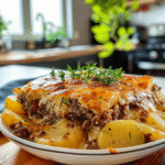 Indulge in the comforting flavors of this Hamburger Potato Casserole, featuring tender layers of potatoes and savory ground beef enveloped in a creamy sauce. Perfect for family gatherings or cozy weeknight dinners, this dish is both satisfying and easy to prepare.