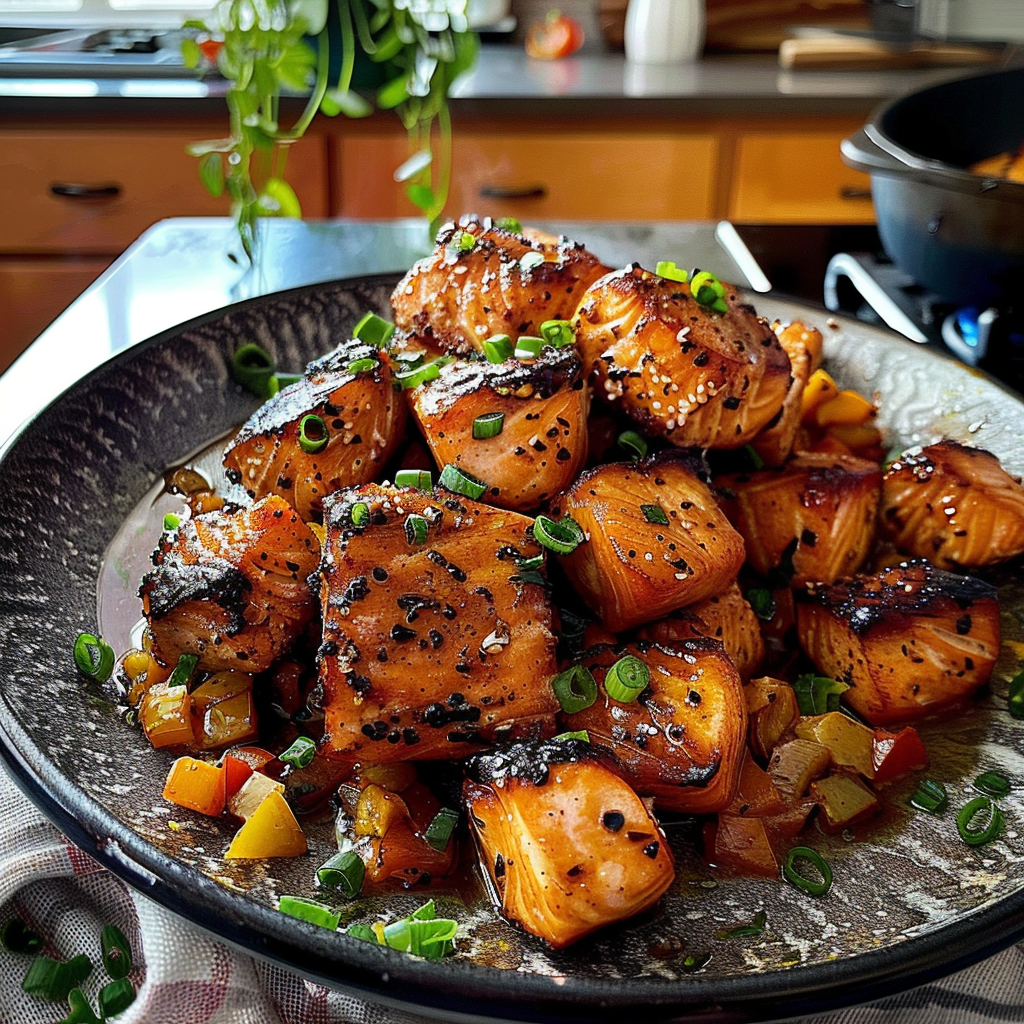 Bang Bang Salmon is a sweet and spicy dish featuring marinated salmon cooked to perfection.