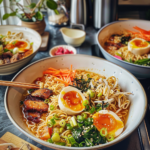 Assemble Your Ramen Bowl: In serving bowls, place cooked noodles first then pour hot broth over them generously. Top with soft-boiled eggs sliced in half, sautéed veggies, bamboo shoots, and strips of nori.