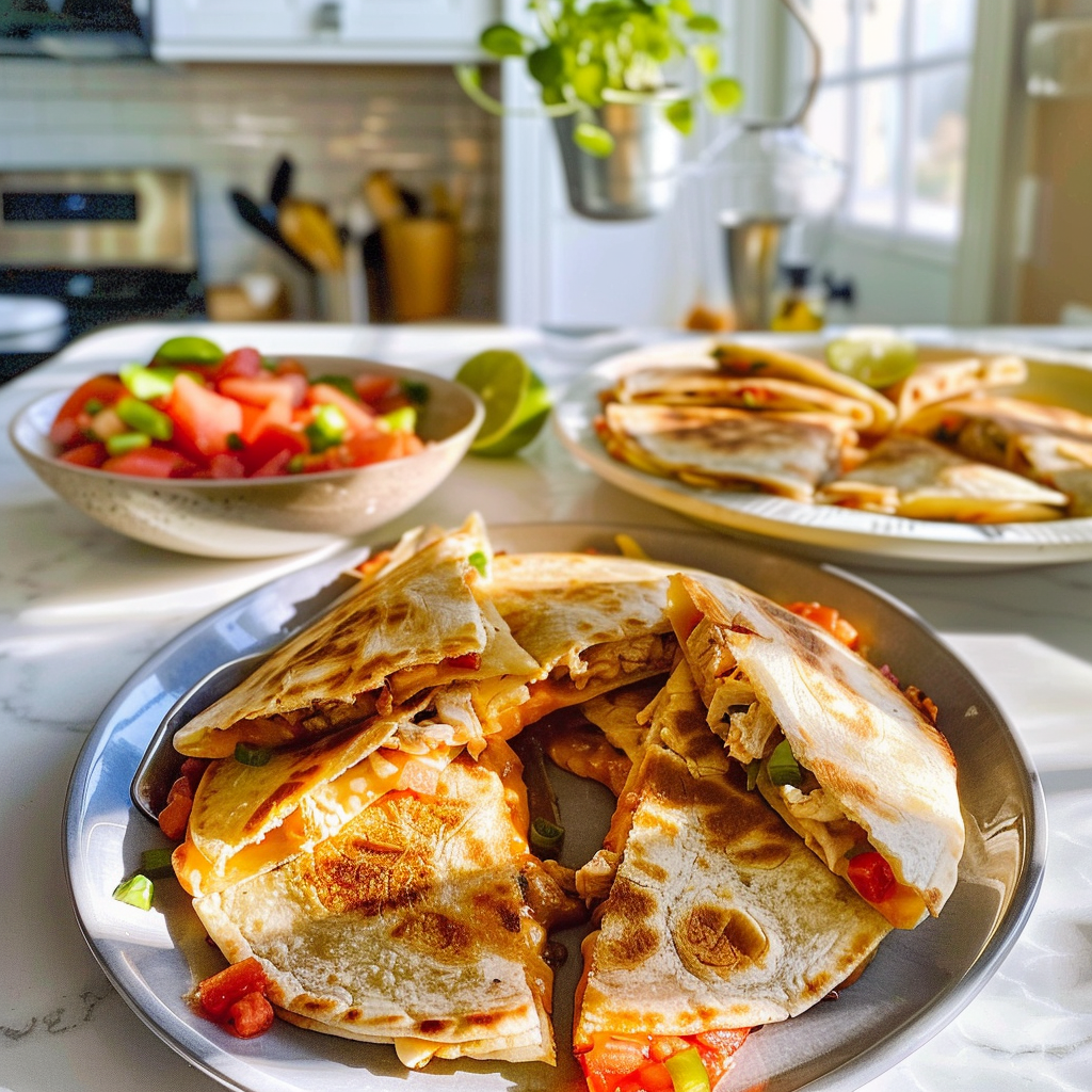 Start by cooking the chicken thoroughly before assembling your quesadillas. Sauté onions and peppers for extra flavor while the tortillas crisp up on another pan.